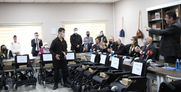 Vali Memiş ve Büyükşehir Belediye Başkanı Mehmet Sekmen sandalye dağıtım töreni ardından engelli bireylerle hatıra fotoğrafı çektirdi.