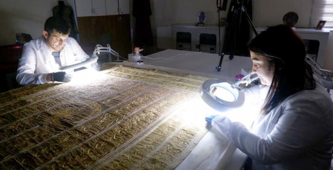 Restorasyon ve onarım planının belirlenmesiyle birlikte; renk analizi, malzeme ve element analizi ve mukavemet tespiti gerçekleştirildi. Dağılan lifler soğuk buhar ve uygun tekniklerle düzleştirilirken, etrafındaki bakır karışımlı püsküller, analizleri ve restorasyon için eserden ayrıldı.