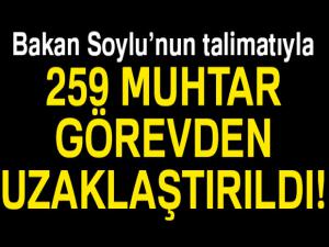 İçişleri Bakanlığı, 259 muhtarın terör örgütleriyle iltisakı veya göreviyle bağdaşmayan eylemleri nedeniyle İçişleri Bakanı Süleyman Soylunun talimatıyla görevinden uzaklaştırıldığını bildirdi.