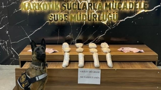 Narkotik köpeği Hera ile yapılan çalışmalarda 4 kilo 100 gram metamfetamin maddesi ve suçtan elde edildiği değerlendirilen 35 bin 915 TL ele geçirildi. Gözaltına alınarak adli mercilere sevk edilen V.K. (62), tutuklanarak cezaevine gönderildi.