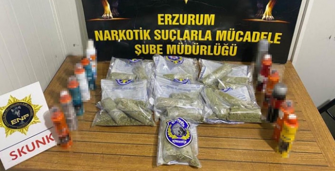 Erzurum'da polisin İran'dan ülkeye giriş yapan bir yolcu otobüsünde yaptığı aramada, saç sprey tüplerine saklanmış 5 kilogram skunk maddesi ele geçirildi.
