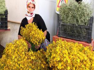 Aktarlarda büyük paralar ödenerek satın alınan kantaron bitkisinin demedi halk pazarında 5 liradan satılıyor.