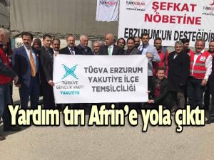 Erzurum Milletvekillerinin de katılımıyla bir tır ihtiyaç maddesi bölgeye uğurlandı. TÜGVA Yakutiye İlçe Başkanı Dinçer Yavuz, teşkilat olarak bu tür yardımları devam ettireceklerini söyledi. Dinçer Yavuz, Afrin Şehitlerimiz ve tüm Şehitlerimizin aziz hatıraları ve Onların emanetlerine her daim sahip çıkacağımızı göstermek adına ve Afrinde ki çocukların, kardeşlerimizin yüzünde bir nebze de olsa gülümseme oluşturabilmek amacıyla Kızılay Erzurum Şube Başkanlığının büyük destekleri ile bir tır dolusu çikolata, bisküvi, bebe bisküvisi gibi gıda malzemesini, hayırsever vatandaşlarımızın da desteği ile kısa sürede hazırladık dedi.