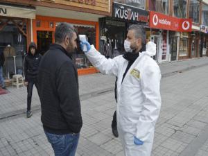 Kentin en işlek caddesi olan Cumhuriyet Caddesi ve diğer caddelerin giriş çıkışlarına bariyerler kurulurken vatandaşların ateşleri sağlık ekiplerince ölçüldükten sonra caddelere alınıyor.