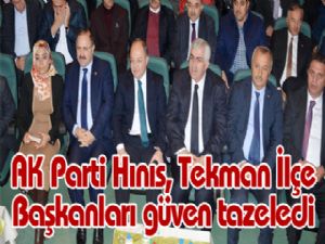 Adalet ve Kalkınma Partisi'nin Hınıs, Tekman İlçe 6'ncı Olağan Kongresi yapıldı. Kongrede Hınıs İlçe Başkanı Mehmet Sönmez, Tekman İlçe Başkanı Taner Özer delegelerin oyunu alarak güven tazeledi.