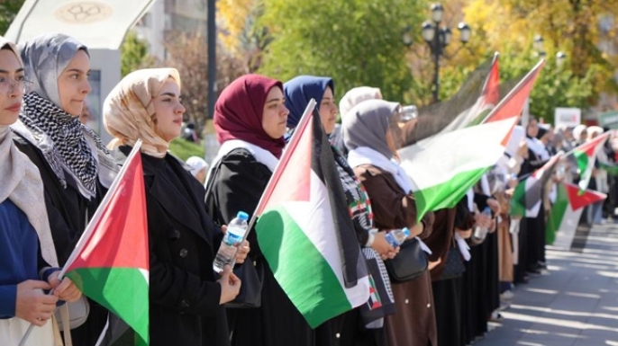 Yakutiye Kent Merkezi'nde toplanan kadınlar el ele tutuşarak, Gazze'ye destek için zincir oluşturdu. Kadınların düzenlediği program destek gördü.