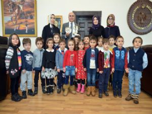 Yakutiye Belediye Başkanı Ali Korkut'u yılın ilk mesai gününde ziyaret eden Gülen Yüzler Anaokulu ve Kreş çocukları, 2017 yılında yapılan park, bahçe ve yeşil alanlar için teşekkür ettiler. Ali Korkut'u yılın başkanı seçen çocuklar, karton bardaktan yapılan 1 numara amblemi ve fıstık kabuklarından öğretmenlerinin yardımıyla yaptıkları Yakutiye amblemli tabağı sundular. Başkan Ali Korkut, çocuklarla tek tek ilgilendi. Kreş Müdürü Gül Özçelik, öğretmenler Meltem Öztürk, Ayyüce Yağar eşliğinde gelen çocuklar Ali Korkut ile hatıra fotoğrafı çekildiler. Çocuklar, Yakutiye'nin önemli projeleri arasında ilk sırada yer alan Üç Kümbetler'e ait proje maketini de ilgiyle izlediler.