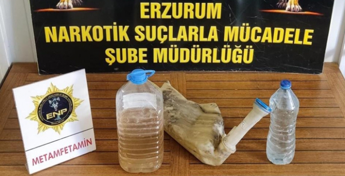 Erzurum’da polis ekipleri tarafından durdurulan bir araçta yapılan aramada, silecek su haznesinde ve plastik şişelerde 5 kilo 250 gram sıvı metamfetamin ele geçirildi.