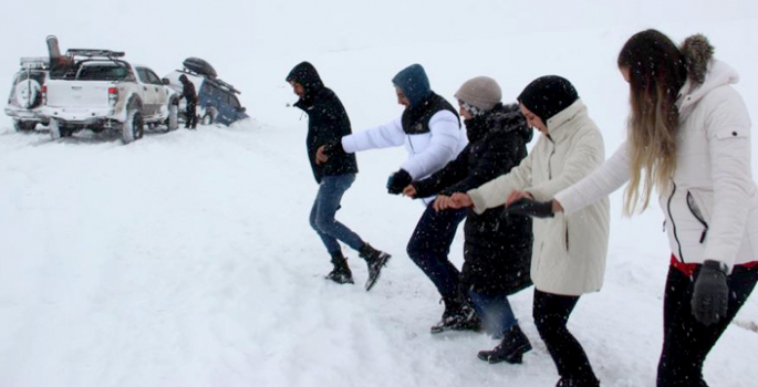 Erzurum’da 3 gündür aralıklarla devam eden kar yağışı sonrası birçok mahalleye ulaşım sağlanamıyor. Off-Road araçları dahi kapanan yollarda ilerlemekte güçlük çekerken birçok araç kara saplandı. Saplanan araçlar bulundukları yerden kurtarılırken bir grup genç ise soğuktan etkilenmemek için araçların yanı başında halay çekti.