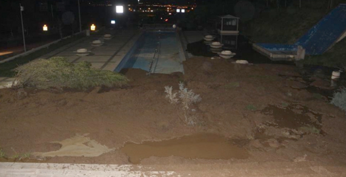 Dik yamaç üzerine kurulu olan parkta su tesisatında meydana gelen arıza sonrası biriken su zemini yumuşatarak toprak kaymasına yol açtı.