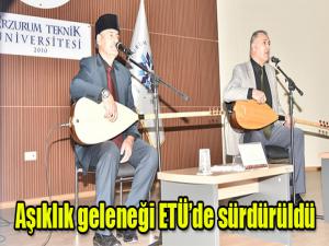 Erzurum Teknik Üniversitesi Edebiyat Fakültesi Türk Dili ve Edebiyatı Bölümü Türkoloji kulübünün organize ettiği Aşıklık Geleneği adlı dinletide Aşık Sıtkı Eminoğlu ve Aşık Selami Yağar, ETÜ İktisadi ve İdari Bilimler-Edebiyat Fakültesi konferans salonunda bir araya gelen Türkü severlere keyifli anlar yaşattılar.