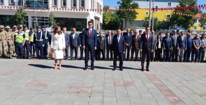 İlçe Kaymakamı Murat Karaloğlu, Belediye Başkanı Dr Ahmet Yaptırmış'ın çelenk sunması sonrasında Atatürk, silah arkadaşları, tüm şehit ve gaziler için 1 dakikalık saygı duruşu ve akabinde İstiklal marşı okundu.