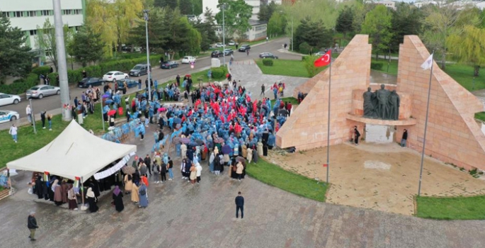 Açıklamanın ardından öğrenciler, Atatürk Gençlik ve Bilim Anıtı önünden merkezi yemekhane önüne kadar ellerinde döviz ve pankartlarla, Filistin'deki soykırıma karşı slogan atarak yürüyüş yaptı.