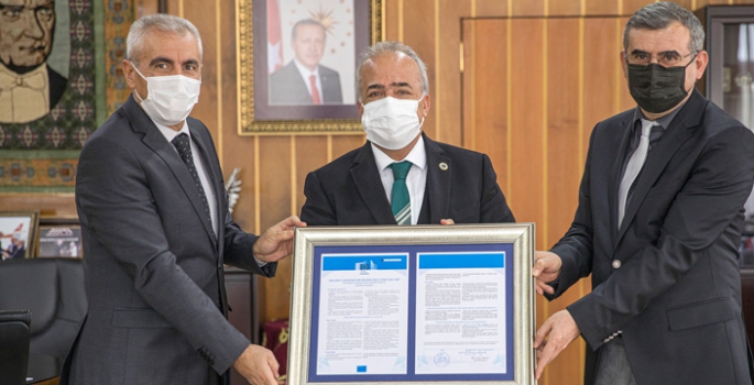 Rektörlük makamında Rektör Çomaklı ile bir araya gelen Dış İlişkilerden Sorumlu Rektör Yardımcısı Prof. Dr. Mustafa Sözbilir ile Dış İlişkiler Ofisi Koordinatörü Prof. Dr. Taşkın Öztaş ECHE Kalite Sertifikasını Rektör Prof. Dr. Ömer Çomaklı’ya takdim etti.