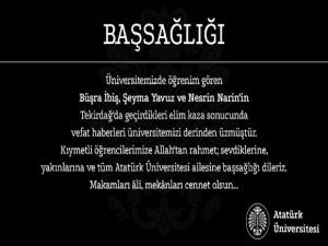 Üniversitemizde öğrenim gören Büşra İbiş, Şeyma Yavuz ve Nesrin Narinin Tekirdağ'da geçirdikleri elim kaza sonucunda vefat haberleri üniversitemizi derinden üzmüştür. Kıymetli öğrencilerimize Allahtan rahmet; sevdiklerine, yakınlarına ve tüm Atatürk Üniversitesi ailesine başsağlığı dileriz. Makamları âli, mekânları cennet olsun