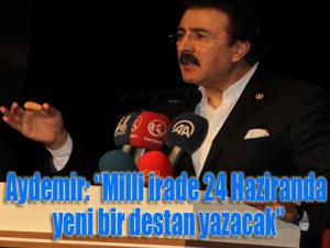 24 Haziran 2018de yapılacak olan seçimlerde milli irade feraset ve basiretinin galip geleceğine, Rabiamızda buluşan gönüllerin 2023 yolunda milli vicdan ve irfanla karar vereceğine inancımız tamdır diyen Milletvekili Aydemir, 15 Temmuzda vesayet odaklarının ihanetleri karşısında AK önderin ufkunda birleşerek tarihi bir duruş sergileyen; 16 Nisan 2017de Cumhurbaşkanlığı hükümet sistemine evet diyerek ülkenin AK hedeflere varma azmini ortaya koyan milli irade, 24 Haziranda yeni bir tarih kaydedecek, ülkemiz AK Önderimiz Sayın Cumhurbaşkanımız Recep Tayyip Erdoğanın izinde 2023lerden 2071lere başlattığı kutlu seferini sürdürecektir. kaydını düştü.