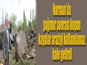 Narman ilçesine bağlı Alabalık Mahallesi'nin bir kilometre aşağısında kuzey denilen mevkiden yağışların ardından kopan dev kayalar 100 dönüme yakın bahçeyi kullanılmaz hale getirdi.
