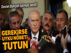 Edinilen bilgilere göre Bahçeli, tüm il başkanlarına 23 Haziran'a kadar tam saha çalışma talimatı verdi. MHP lideri YSK seçimleri yenileme kararı alırsa, mitili İstanbul'a atacağımı söylemiştim. Siz de şimdi yatağınızı, yorganınızı alın, İstanbul'da çalışmalara başlayın. Gerekirse uyku nöbeti tutun dedi. Bahçeli, il başkanlarından Seçmenleri küstürmeme ve tüm eleştirileri dinleyerek, eleştirileri dikkate almaları yönünde de talimat verdi.