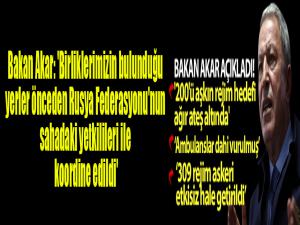 Birliklerin bulunduğu yerlerin önceden Rusya Federasyonu'nun sahadaki yetkilileri ile koordine edilmesine rağmen bu saldırının gerçekleştirildiğini aktaran Bakan Akar, "Birliklerimizin bulunduğu yerler önceden Rusya Federasyonu'nun sahadaki yetkilileri ile koordine edilmesine rağmen bu saldırı gerçekleştirilmiş, ilk atışa müteakip bir kez daha uyarı yapılmasına rağmen maalesef saldırı devam etmiştir. Bu hava saldırıları sırasında ambulanslar dahi vurulmuştur. Ayrıca bu saldırı sırasında birliklerimizin etrafında hiçbir silahlı grubun da bulunmadığını burada belirtmek isterim. Hain saldırı sonrasında uçak, SİHA ve kara ateş destek vasıtalarımızla derhal 200'den fazla rejim hedefi ağır şekilde ateş altına alınmıştır. Bu atışlar sonucunda 5 helikopter, 23 tank, 10 zırhlı araç, 23 çeşitli cins ve çapta top ve obüs, 5 mühimmat kamyonu, bir SA-17, bir SA-22 hava savunma sistemi, 3 mühimmat deposu, 2 malzeme deposu, bir karargah binası ve 309 rejim askeri etkisiz hale getirilmiştir. Atışlarımız ve faaliyetlerimiz planlandığı şekilde devam etmektedir" ifadelerini kullandı.