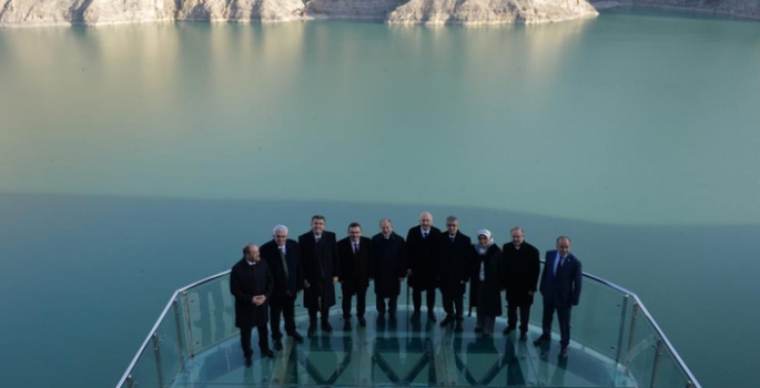 Türkiye'nin en büyük cam terasında gölü izleyen Bakan Karaismailoğlu, 12,3 metre uzunluğunda, 545 metre kare kapalı, 565 metrekare açık alana sahip ve 143 metre yükseklikte yer alan cam terasın bölgenin turizm potansiyeli için önemli olduğuna dikkat çekti.