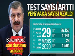 Bugün 36 bin 155 test yapılırken, bin 141 yeni vaka tanısı konuldu, bin 594 kişi ise iyileşti. Bakan Koca, 'Test sayısı arttı, yeni vaka sayısı azaldı. Yoğun bakım ve entübe hasta sayısında düşüş devam ediyor' dedi.