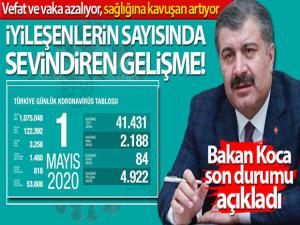 Bugün toplam 41 bin 431 test yapılırken, 2 bin 188 yeni vaka tanısı konuldu, 4 bin 922 kişi iyileşti. Bakan Koca, Son 24 saatte iyileşenler, yeni tanı konan hastaların 2,25 katı. Toplam iyileşen sayısı 53 bin'' dedi.