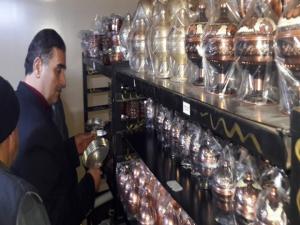 Abdullah Keleşoğlu, Bakır İşlemeciliği Atölyesinde çalışan ustalar ile bir süre sohbet ettikten sonra, atölyede imalat edilen eserleri inceledi.