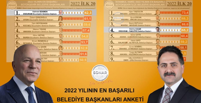 Sonar Araştırma Şirketi tarafından yapılan ankette Başkan Mehmet Sekmen birinci olurken, Yakutiye Belediye Başkanı Dr. Mahmut Uçar da ilçe belediyeleri arasında “Türkiye’nin En Başarılı Dördüncü Belediye Başkanı” seçildi. Yapılan ankette Başkan Sekmen, ülke genelinde yapılan ankette yüzde 62,3 oy oranıyla birinci seçilirken Başkan Uçar da dördüncü olduğu ankette yüzde 65,2 oy aldı.