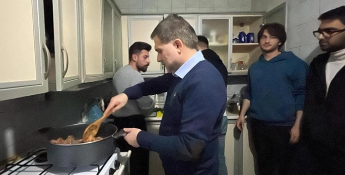Yumurtalı kıymalı pide yaptırarak üniversiteleri gençlerin öğrenci evine konuk olan Uçar, elleriyle yaptığı kıymayla da gençlerden tam not aldı.