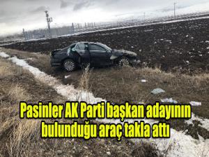 Pasinler AK Parti İlçe Belediye Başkan adayı Ahmet Dölekli'nin bulunduğu araç Altınbaşak mahallesinden ilçe merkezine gelirken takla attı. Yolun kaygan olması nedeniyle meydana geldiği belirtilen trafik kazasında Başkan Adayı Dölekli ile birlikte 5 kişi yaralandı.