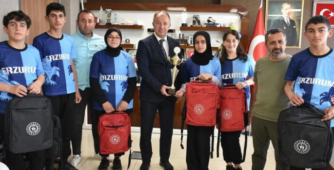 Gençlik ve Spor Bakanlığı Okul Sporları kapsamında 26-28 Mayıs 2025 tarihlerinde yapılan Floor Curling Yıldızlar Türkiye Şampiyonası, ikinci olan Tuzcu Mimar Sinan Ortaokulu sporcuları, Beden Eğitimi Öğretmeni Mahmut Atmaca ve okul müdürü Yakup Öztürk, Erzurum Gençlik ve Spor İl Müdürü Levent Çakmur’u ziyaret ederek başarıları kendisiyle paylaştılar. GSİM Müdürü Çakmur, başarılı sporcuları tebrik ederek hediye takdim etti.