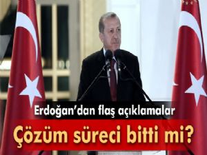 Çin'e hareketi öncesi konuşan Erdoğan, çözüm sürecinin geleceğiyle ilgili soruyu yanıtladı. Cumhurbaşkanı, "Çözüm süreci karşılığını görmedi, ortada hasar var. Sürecin İstismar edildiğini gördük. Türkiye'nin birliğine ve bütünlüğüne kastedenlerle çözüm sürecini devam ettirmek mümkün değildir" diye konuştu.