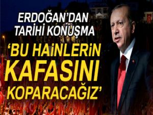 15 Temmuz darbe girişiminin ilk saldırı olmadığını söyleyen Cumhurbaşkanı Erdoğan, "Son saldırı da olmayacaktır. Terör örgütlerinin piyon olarak kullananların asırlık kuyruk acılarının çok iyi farkındayız. FETÖ'nün sadece FETÖ, PKK'nın sadece PKK DEAŞ'ın sadece DEAŞ olmadığını diğer terör örgütlerini sadece görünen yüzlerinden ibaret olmadığını çok iyi biliyoruz. Arkalarında kimler olduğunu çok iyi biliyoruz. Piyonlarını ezip geçmeden atları, veziri alıp şahı da mat edemeyiz. Önce bu hainlerin kafasını kopartacağız. Kandil'de Besler deresinde bütün dağlarda şu anda askerimiz, komandolarımız güvenlik güçlerimiz oralarda bunları tek tek temizliyorlar" dedi. Kalabalık idam diye bağırınca, "Türkiye hukuk devleti, Parlamentadan geçip bana gelmesi halinde ben de onaylarım" dedi.