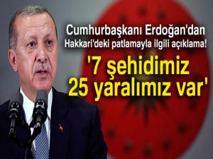 Fransa ziyareti öncesi basın mensuplarına açıklamalarda bulunan Cumhurbaşkanı Recep Tayyip Erdoğan, "Hakkari'de bir mühimmat depomuzun patlaması sonucu 7 şehidimiz var, bunun dışında 25 yaralımız var. Mühimmatın miadının dolması gibi bir durumun olmadığını Savunma Bakanımız bana iletti" dedi.