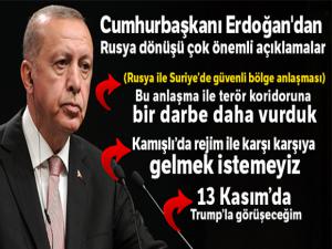 Cumhurbaşkanı Recep Tayyip Erdoğan, Fırat'ın doğusunda 20 mil derinliğinde oluşturulacak güvenli bölge konusunda Türkiye-ABD arasında varılan mutabakatın ardından Rusya Devlet Başkanı Vladimir Putin ile Soçi'de bir görüşme gerçekleştirdi. Cumhurbaşkanı Erdoğan, başta Suriye'nin kuzeyi olmak üzere birçok bölgesel ve ikili meselenin ele alındığı görüşme sonrası için Türkiye'ye dönerken gazetecilerin sorularını cevaplandırdı.