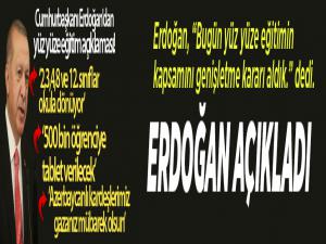 Havaların soğumasıyla birlikte artacak mevsim hastalıklarının Covid-19 ile benzerlikler taşıdığı için süreci çok daha dikkatli şekilde yürütmeleri gerektiğinin farkında olduklarının altını çizen Erdoğan, "Aynı zamanda eğitimden ticarete, spordan sosyal faaliyetlere kadar pek çok hususta ertelenen ihtiyaçların yol açtığı sıkıntıların da bilincindeyiz. Sağlık önceliklerimizden taviz vermeyecek şekilde bu sıkıntıları da aşamalı olarak çözüme kavuşturacak yöntemler geliştiriyoruz. Eğitimde daha önce okul öncesi ve birinci sınıflarda yüz yüze eğitimi sınırlı şekilde başlatmıştık. Diğer sınıflarda da uzaktan eğitim yoluyla eğitim öğretime geçilmesini temin etmiştik. Bugün yüz yüze eğitimin kapsamını genişletme kararı aldık. İlkokul birinci sınıfların yanı sıra ikinci, üçüncü ve dördüncü sınıflarda da yüz yüze eğitimi belirlenen kurallar çerçevesinde başlatıyoruz. Bunlara ilave olarak ortaokul sekizinci ve lise 12. sınıflarda da yine belirlenen kurallar dahilinde yüz yüze eğitime geçilecek. Ayrıca özel eğitim okulları ile İl Hıfzıssıhha Kurullarının uygun bulduğu köy okullarında da yüz yüze eğitimin önünde herhangi bir engel olmadığı görülmüştür. Diğer sınıflarla ilgili kararı gelişmelere bakarak önümüzdeki haftalarda vereceğiz diye konuştu.