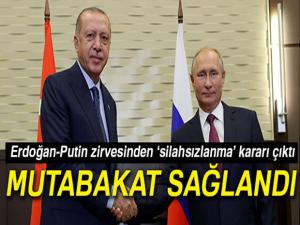 Putin'le Suriye konusunu son olarak Tahran'da düzenlenen üçlü zirvede ele aldıklarını ifade eden Erdoğan, Türkiye olarak Tahran'da hassasiyetlerimizi açıkça ifade etmiştik. Bugün ise Tahran'da vardığımız mutabakatı sahada nasıl hayata geçirebileceğimizi müzakere etme imkanını bulduk. İkili ve heyetler arası görüşmelerimizde, İdlib'de karşılıklı endişelerimizi dikkate alan çıkış yolu bulunması konusunda da çok önemli mesafe katettik. Sayın Putin'le İdlib meselesinin Astana ruhuna uygun bir anlayış temelinde çözümü konusunda mutabık olduğumuzu bir kez daha gördük. Bu çerçevede yaptığımız değerlendirmelerin sonucunda muhalifler ve rejim kontrolündeki alanlar arasında silahlardan arındırılmış bir bölge oluşturulmasını kararlaştırdık. Muhalifler bulundukları alanda kalmaya devam edecekler. Buna karşılık radikal grupların söz konusu alanda faaliyet göstermemelerini sağlayacağız. Rusya, İdlib çatışmasızlık bölgesinde saldırılmayacağını temin için gereken tedbirleri alacaktır. Gerek üçüncü tarafların provokasyonlarını, gerekse varılan mutabakata yönelik ihlallerin tespitini ve engellenmesini de yine birlikte temin edeceğiz. Bu amaçla Rusya ve Türkiye, belirlenecek silahsızlandırılmış bölge sınırlarının iki tarafında koordineli devriye faaliyeti gösterecektir. Türkiye, halen İdlib çatışmasızlık bölgesinde bulunan gözlem noktalarını da tahkim edecektir. Bu mutabakatla İdlib'de büyük bir insani kriz yaşanmasının önüne geçtiğimize inanıyorum. Türkiye, Suriye krizinin başından beri olduğu gibi İdlib meselesinde de üzerine düşeni yapmaya devam edecektir şeklinde konuştu.