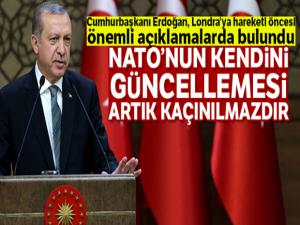 Türkiye'nin, DEAŞ ile Suriye'de göğüs göğse mücadele eden ve örgütü bozguna uğratan tek ülke olduğunu vurgulayan Erdoğan, Bu samimi çabalarımızın karşılığını biz de müttefiklerimizden bekliyoruz, terörle mücadelesinde ülkemize amasız fakatsız destek verilmesini istiyoruz. Londra toplantısı sembolik anlamanın ötesinde ittifakın 2020'li yıllara kendini uyarlamasının da ilk adımı olacaktır. Bazı çevreler art niyetli bir şekilde ülkemizin NATO'ya mensubiyetini gölgelemeye çalışsalar da bizim yerimiz ve duruşumuz bellidir. 1952'den beri yaptığımız katkılar Türkiye'nin NATO'daki vazgeçilmez konumunu gayet net gösteriyor. Ülkemizle ilgili kötü niyetli tartışmaları dikkate almadık almıyoruz.