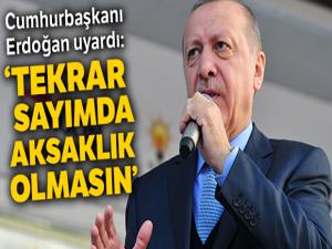 Cumhurbaşkanı Recep Tayyip Erdoğan, önceki gün Dolmabahçe'deki ofisinde seçim toplantısı yaptı. Parti kurmayları ve bazı bakanların da katıldığı toplantıda Cumhurbaşkanı Erdoğan, yeniden oy sayımının yapıldığı sandıklarda aksaklıkların olmaması ve titiz davranılması talimatı verdi. Dolmabahçe'deki Cumhurbaşkanlığı Çalışma Ofisindeki toplantıya İstanbul Büyükşehir Belediye Başkan Adayı Binali Yıldırım, Genel Başkan Yardımcıları Nurettin Canikli ve Mahir Ünal ile AK Parti Genel Başkanvekili Numan Kurtulmuş ve bazı bakanlar katıldı.