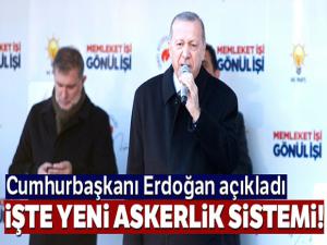 Yeni askerlik sistemini açıklayan Cumhurbaşkanı Erdoğan, Türkiye'nin, bölgenin ve dünyanın en büyük ordularından birine sahip olduğuna işaret ederek, "Ordumuzun yapısını güçlendirmek bizim en temel görevimizdir. Yurdumuzun ihtiyaçlarını göz önünde bulundurarak, Genelkurmay ve Savunma Bakanlığı'na talimat verdim. Gençlerimizin merakla beklediği askerlikte belli noktaya gelindi. Yeni sistemde lisans ve lisans üstü için ordumuzun ihtiyacına göre, belirlenecek sayıda, 12 aylık yedek subaylık devam ediyor. 2 yıllık meslek yüksek okulu mezunları için ise, yine yeni bir adım attık. İhtiyaca göre belirlenecek sayıda 12 aylık yedek astsubaylık uygulaması getiriyoruz. Yedek subaylık ve yedek astsubaylık görevlerini yerine getirenlere, 2 aylık eğitimleri döneminde harçlık verilecek. 10 aylık kıta görevlerinde ise maaş ödenecek. Lise ve altı mezunları için ve diğer eğitim gruplarından isteyenler için 6 ay + 6 aylık bir askerlik uygulaması getiriyoruz. 1 aylık eğitimini tamamlayıp, 5 aylık kıta görevini bitirerek ilk 6 ayı tamamlayanlar isterlerse terhis olabilecekler. Şayet askerliğe devam etmek isteyenler ise 6 ay süre ile maaşlı olarak görev yapacak. Bu 12 aylık görevin bitiminde arzu eden askerlerimiz sözleşmeli er ve erbaş kadrolarına geçip müracaat edebilecek" diye konuştu.