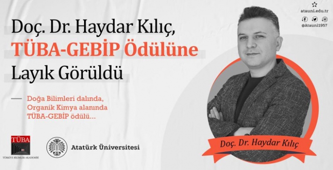 Atatürk Üniversitesi Fen Fakültesi Kimya Bölümü öğretim üyelerinden Doç. Dr. Haydar Kılıç; Doğa Bilimleri dalında, Organik Kimya alanında TÜBA-GEBİP ödülünü almaya layık görüldü.