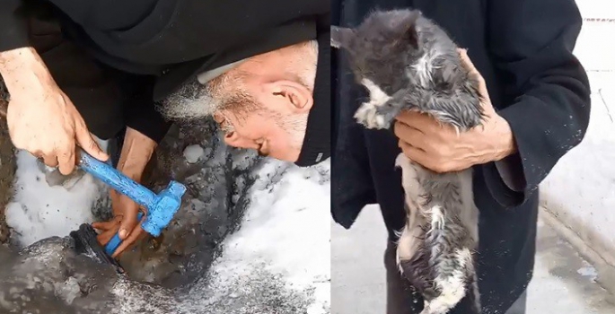 Boru içerisinde sıkışan kedinin çıkacağı alanın buzla kaplandığını gören Çınar, eline aldığı çekiç ve murçla dakikalarca kediyi kurtarmak için mücadele etti. Buzu kırmayı başaran Çınar yavru kediyi donmak üzereyken kurtarmayı başardı.
