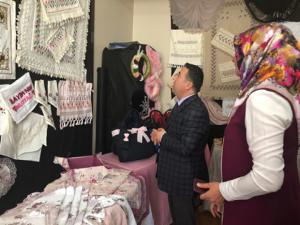 Merkezde tedavi gören engelli çocukların annelerinin Halk Eğitim Merkezi eğitmenlerinden Kübra Cengiz nezaretinde yaptıkları el sanatları ürünleri sergileniyor.