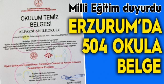 Erzurum İl Milli Eğitim Müdürlüğünden yapılan açıklamada "Eğitim Kurumlarında Hijyen Şartlarını Geliştirme ve Enfeksiyonu Önleme Kılavuzu" çerçevesinde okullarımız; sağlıklı, hijyenik ve salgına karşı güvenilir bir mekân olabilmesi için aralıksız çalışmaktadır. ‘Okulum Temiz’ belgesi almak için başvuruda bulunan okulların oranı yüzde 92’ye ulaşmış ve şu ana kadar 504 okulumuz ‘Okulum Temiz’ belgesi almıştır. Ayrıca diğer tüm okullarımızda da standartların tam olarak karşılanması için hijyen tetkik görevlilerinin rehberliğinde çalışmalar devam etmektedir.” denildi.