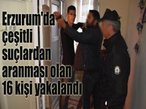 Erzurumda çeşitli suçlardan aranması olan 16 şahıs, Emniyet Müdürlüğünün yaptığı çalışmalar neticesinden yakalandı.