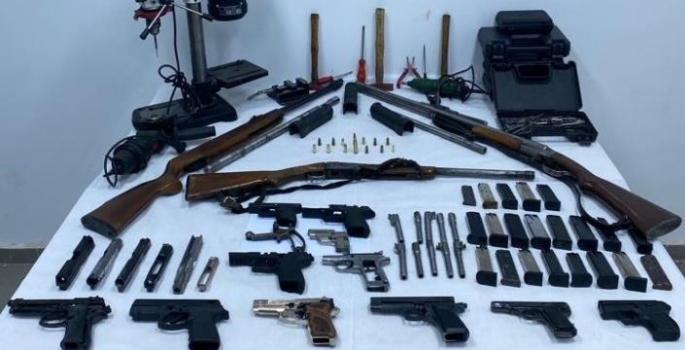 İş yerinde yapılan aramalarda, 5 adet el yapımı ruhsatsız seri numarası olmayan 9 mm. çapında tabanca, 1 adet el yapımı ruhsatsız seri numarası olmayan 7,65 mm. çapında tabanca, 3 adet markasız ve ruhsatsız seri numarası olmayan av tüfeği, 10 adet el yapımı ruhsatsız seri numarası olmayan 9 mm. çapında tabanca namlusu, 6 adet el yapımı ruhsatsız seri numarası olmayan 9 mm. çapında tabanca üst kapak takımı, 6 adet el yapımı ruhsatsız seri numarası olmayan 9 mm. çapında tabanca kabza ve gövdesi, 58 adet 9mm.çapında markasız seri numarasız tabanca şarjörü, 1 adet freze makinası, 1 adet masa üstü matkap, 1 adet matkap, 1 adet marka taşlama makinası, silah tamir, bakım ve yapımında kullanılan çok sayıda 154 adet iğne, 201 yay, 36 İcra mili, 23 adet tetik, 78 adet pim malzeme ele geçirildi.