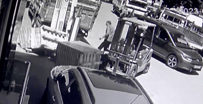 Baba Aleaddin Ataş’in forkliftle laminant yüklü paletleri kamyona yüklediği esnada paletlerin devrilmemesi için müdahale eden oğlu Ahmet Ataş, bir anda yıkılan paletlerin altında kaldı.