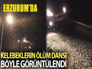 Erzurumda 'kelebeklerin ölüm dansı' geceyi beyaza bürüdü. Sokak aydınlatma direklerinin ışıklarının etrafında dakikalarca uçup, bir süre sonra ölen kelebekler, yerde beyaz bir örtü oluşturdu.