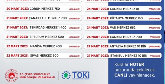 Bakanlık açıklamasında 20-27 Mart tarihleri arasında 32 bin 113 hak sahibi için müstakil ve müşterek arsa kuralarının noter huzurunda şu illerde çekileceği belirtildi: