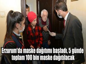Erzurum merkez mahallelerinde Valilik tarafından ücretsiz olarak maske dağıtımına başlandı. Valilik tarafından oluşturulan Vefa Destek Ekiplerince maskeler ev ev dolaşılarak dağıtılıyor.